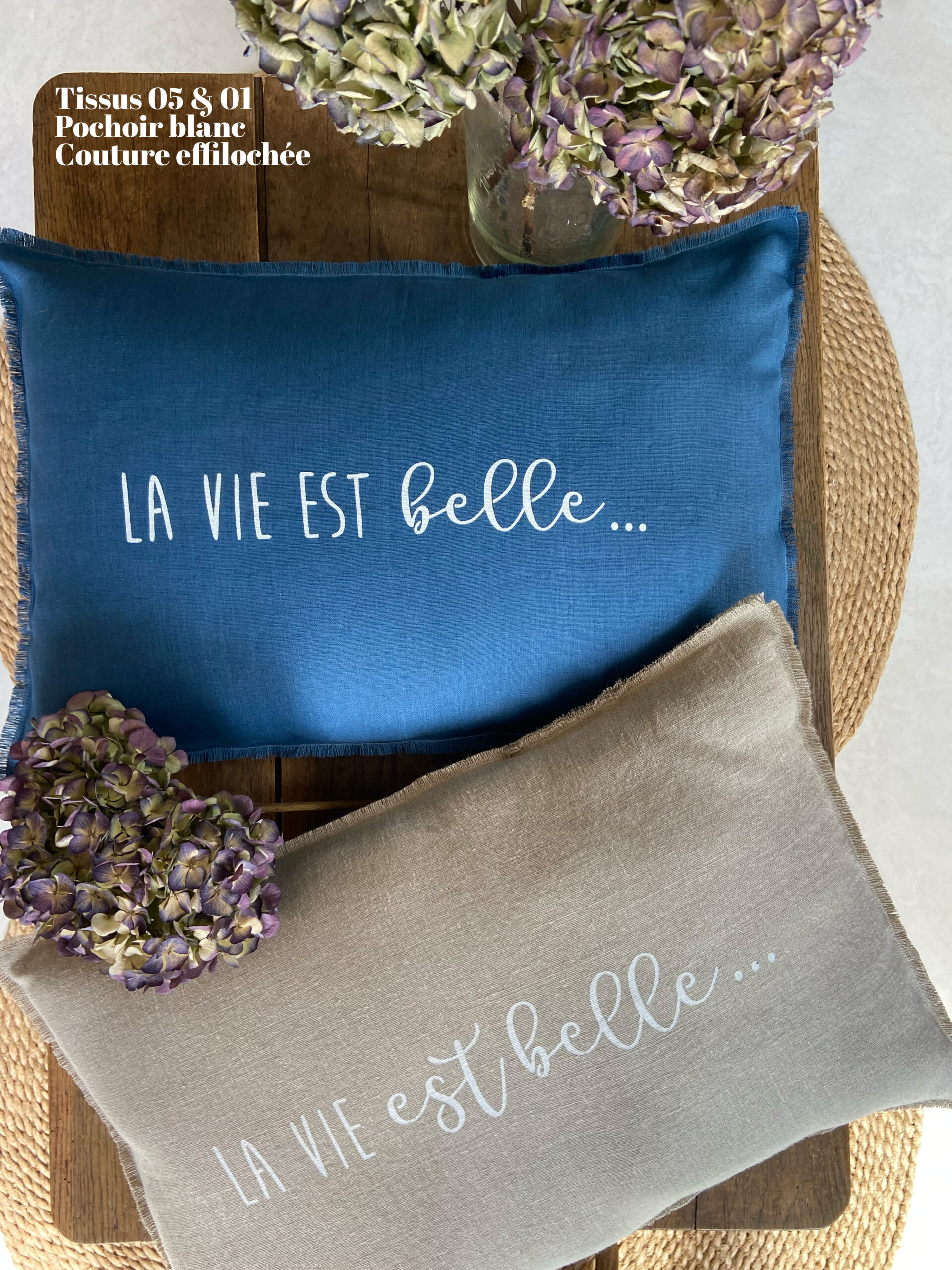 -> La couleur du pochoir (selon la couleur du lin) : Noir – Blanc – Blanc cassé – Rouge – Or – Argent – Bleu Marine – Taupe – Fuchsia – Bordeaux
