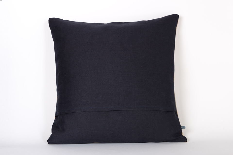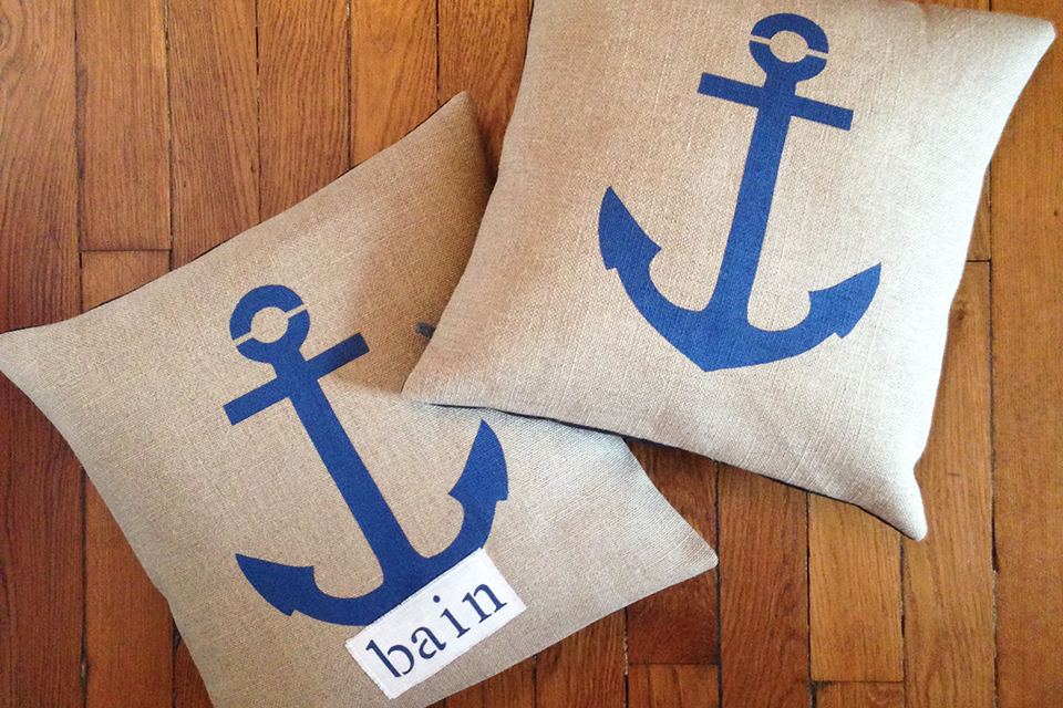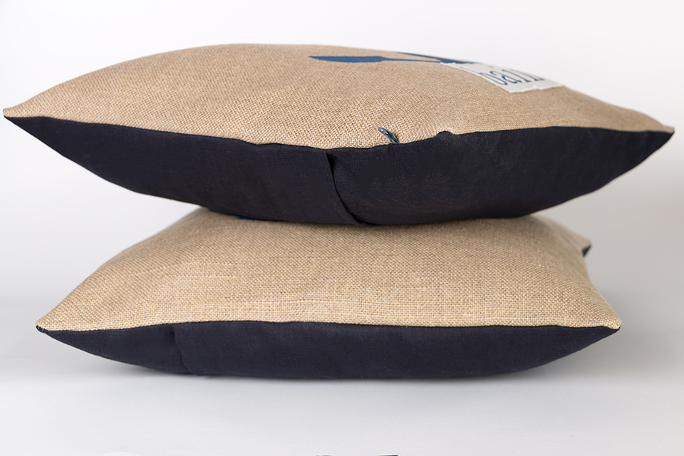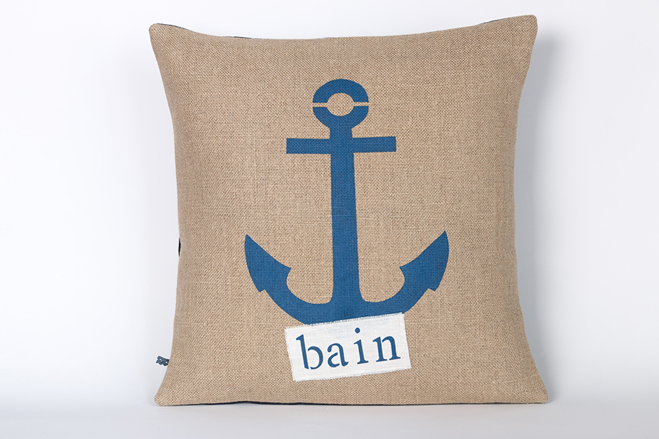 Détails : l’Ancre bleue et le mot « bain » sont réalisés à la main au pochoir et le dos du coussin est en lin bleu marine