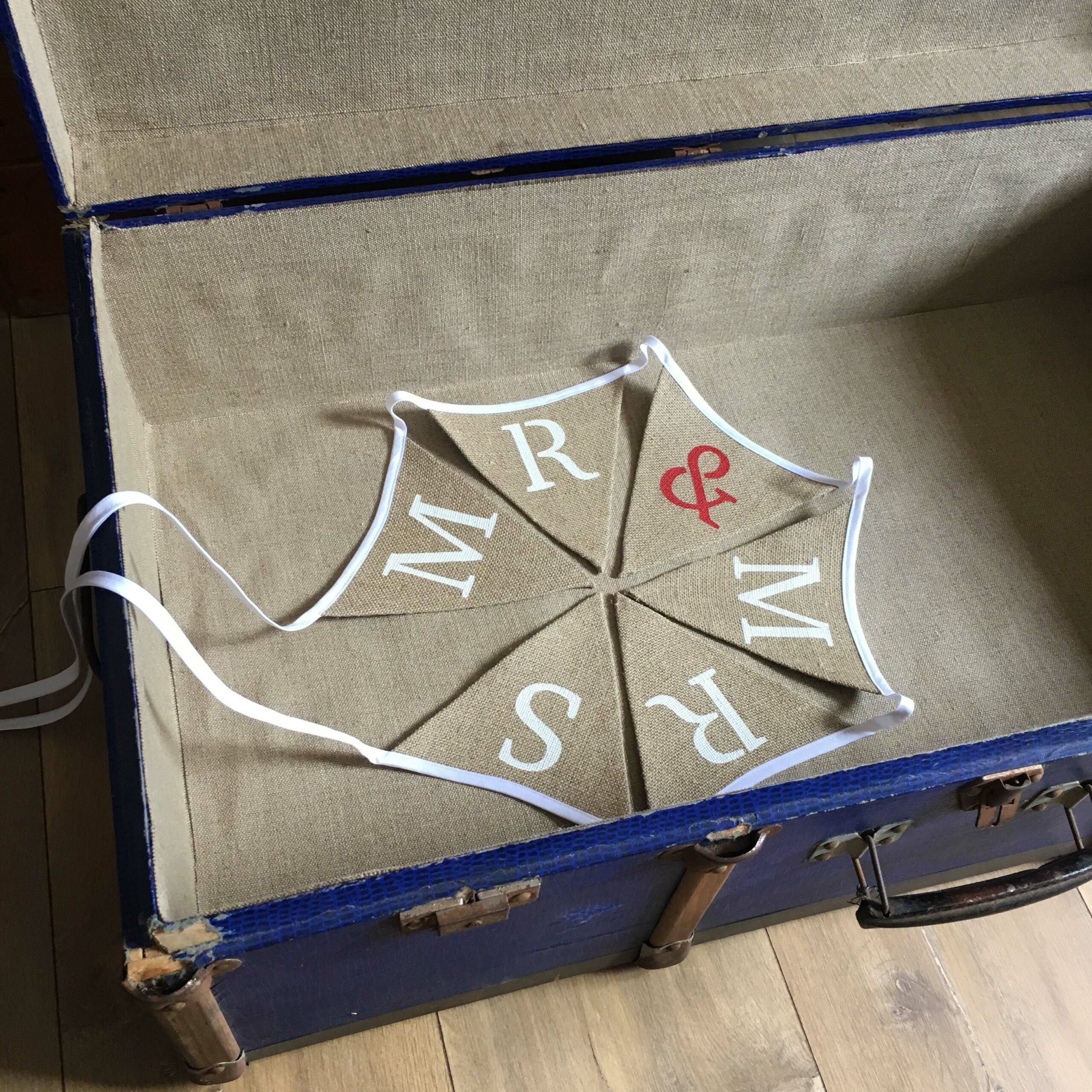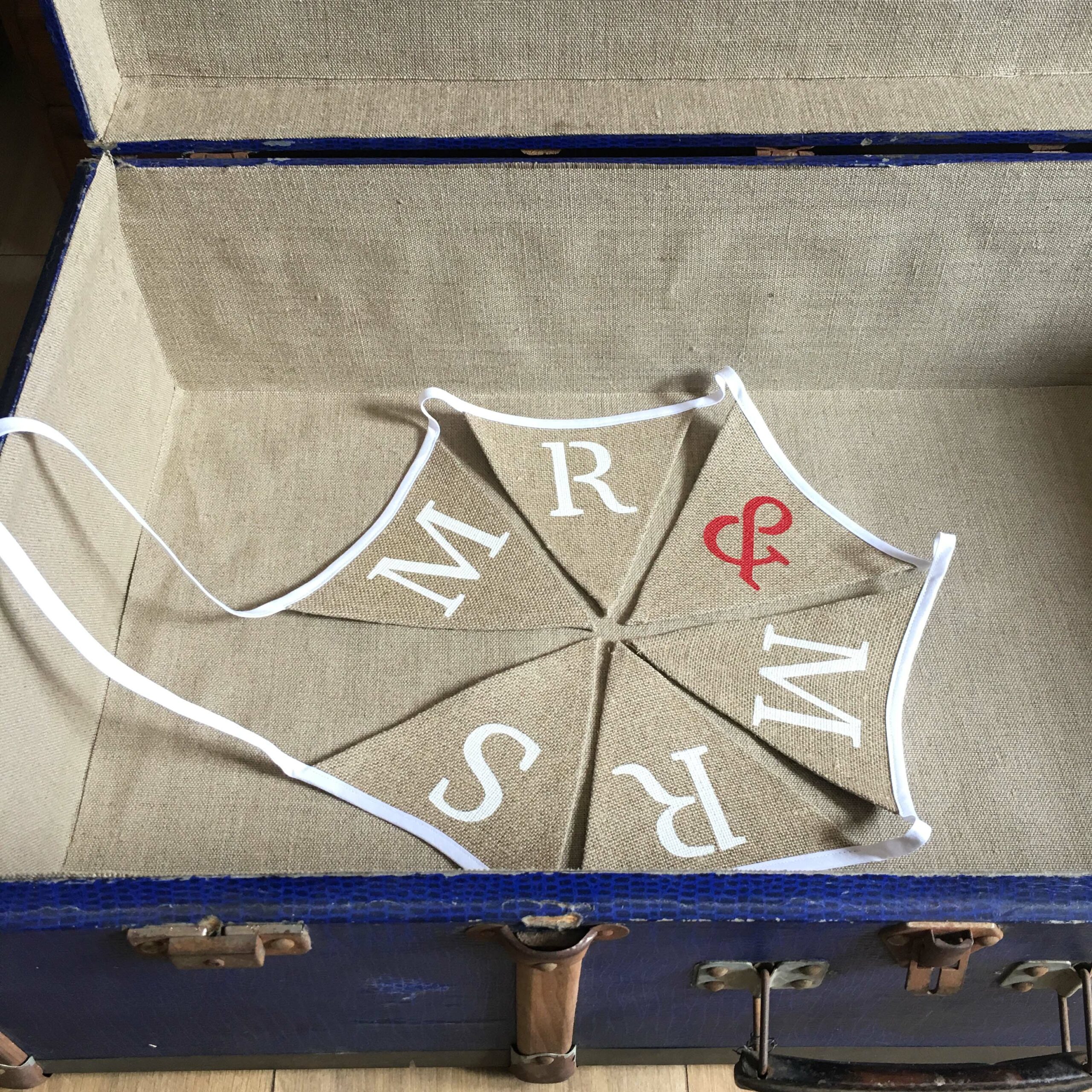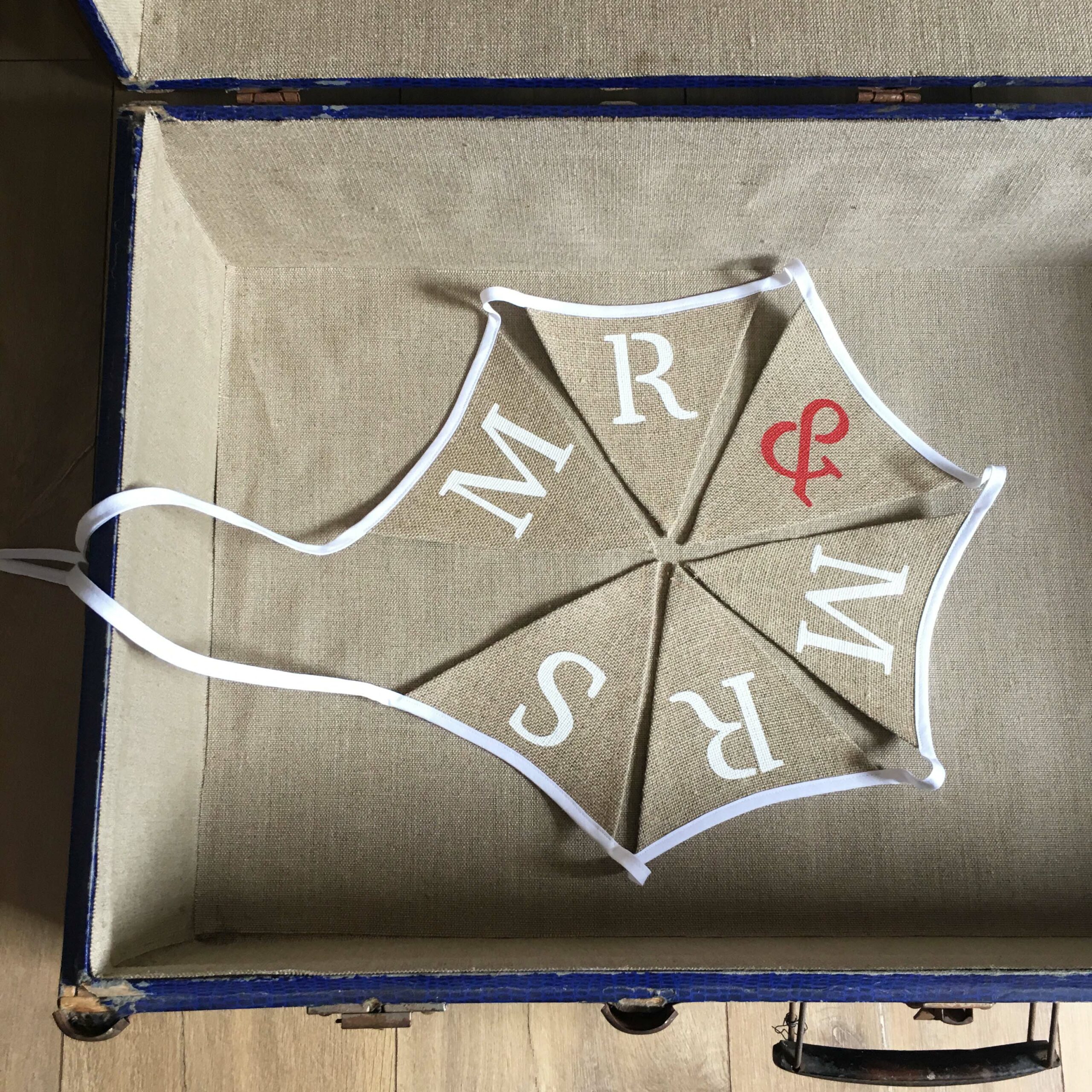 Guirlande de 6 fanions(+/- de 2 m) avec l’inscription MR & MRS en blanc et rouge accrochés par un biais blanc.