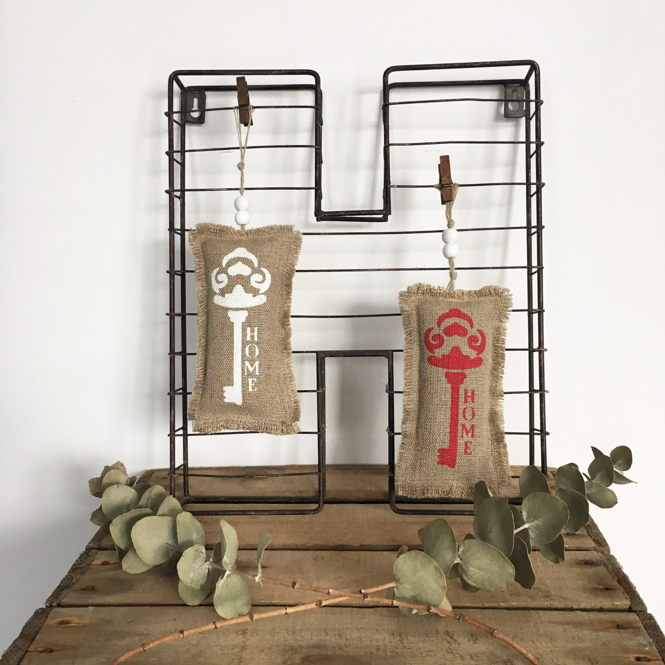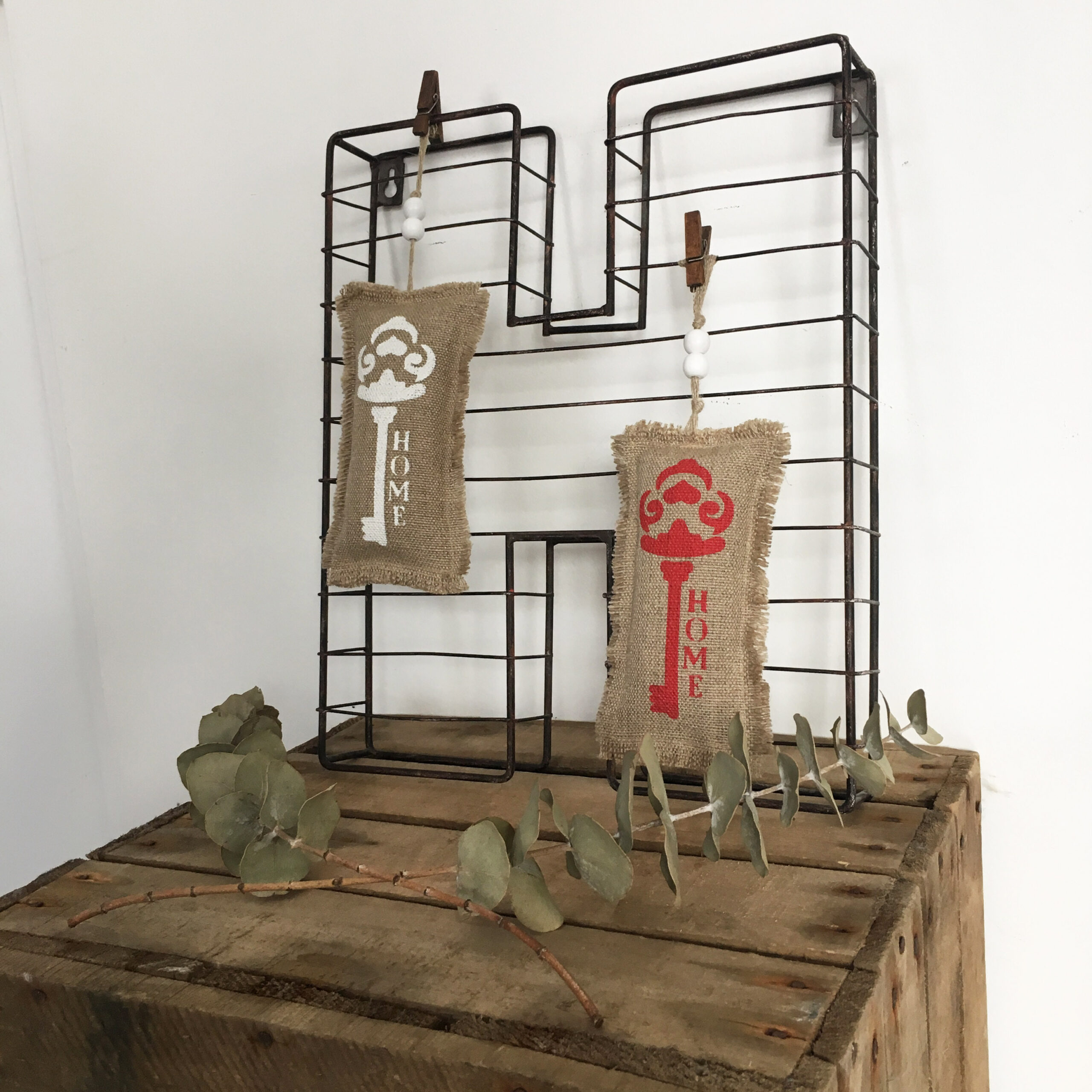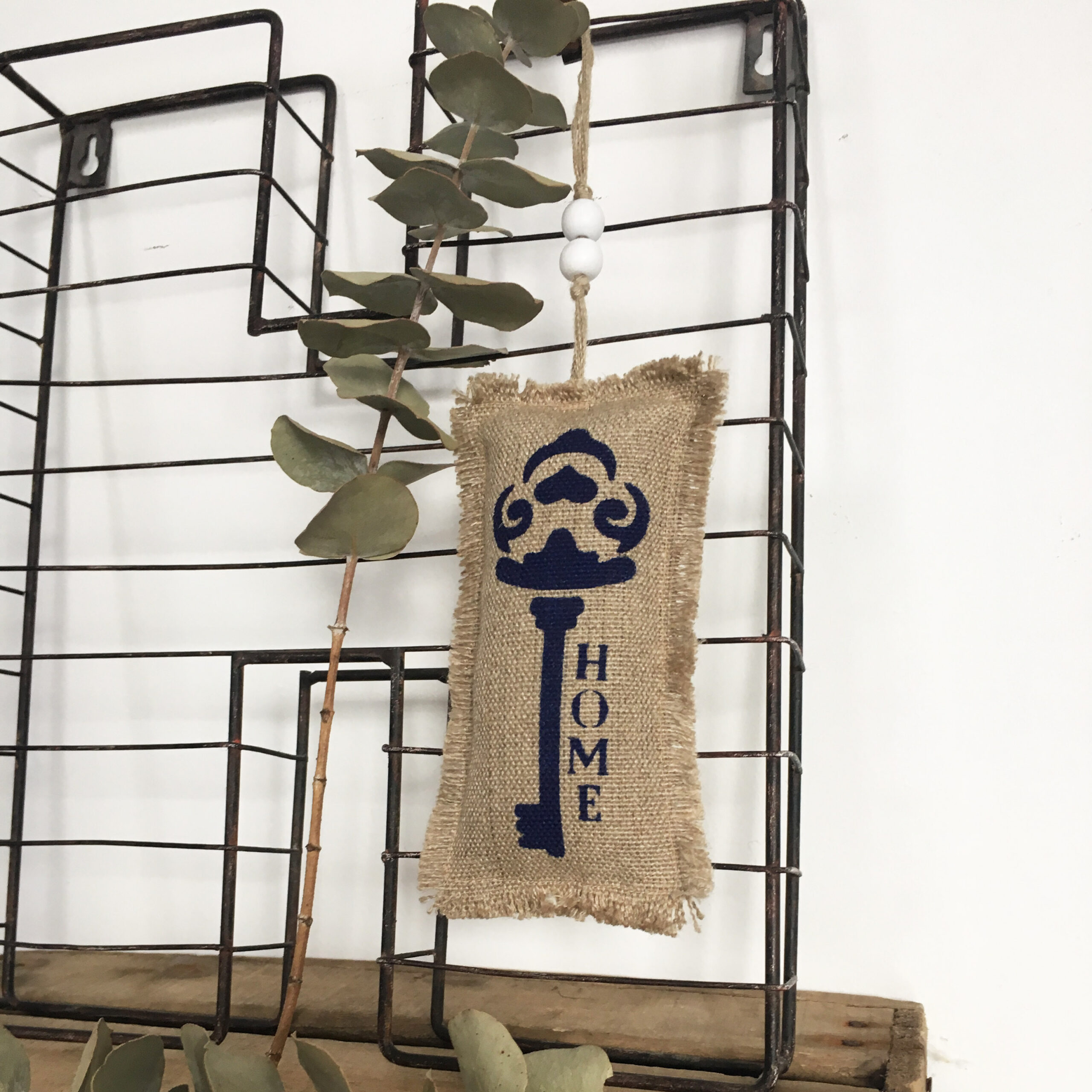 Détails : les clés sont réalisées au pochoir à la main et les liens sont en fil de lin.