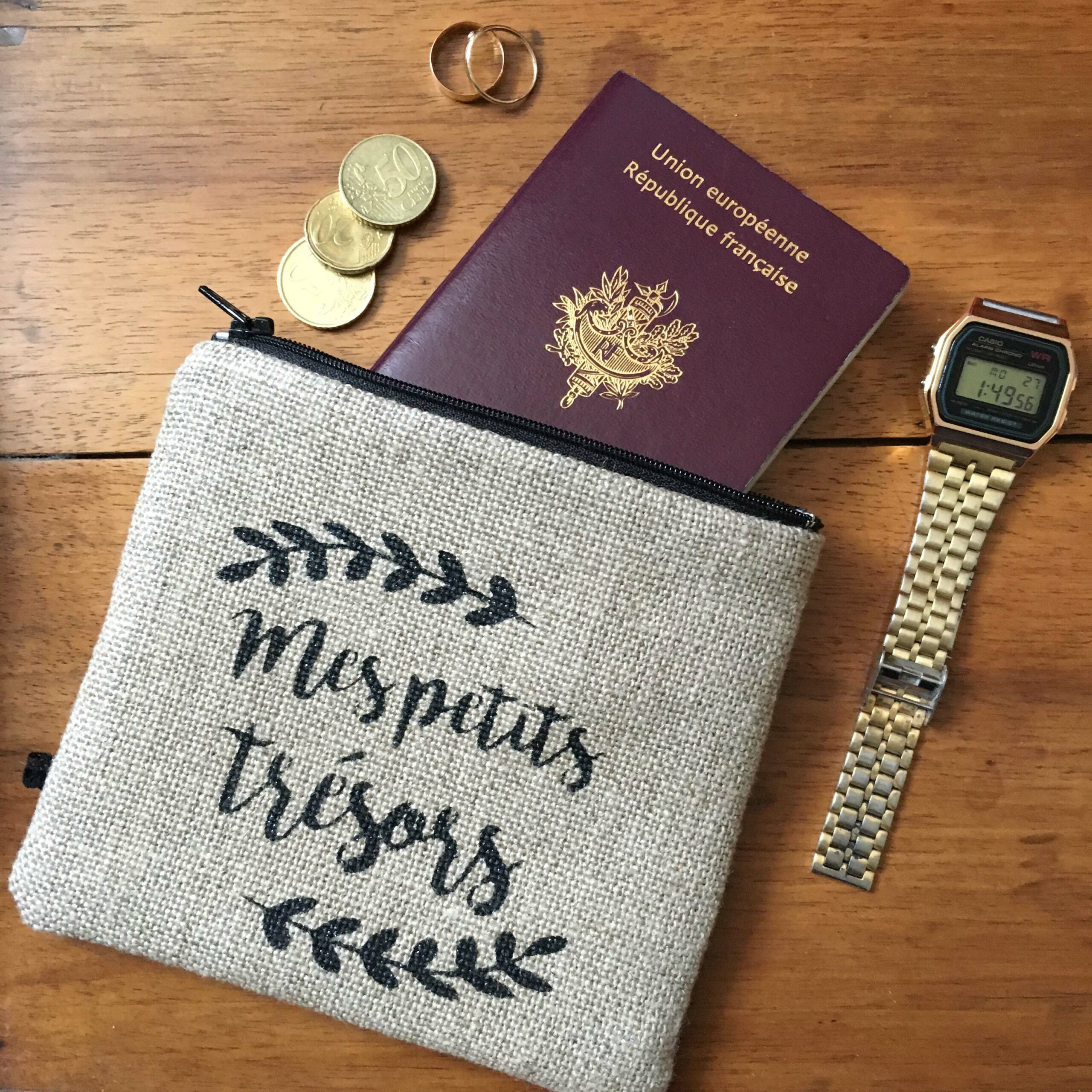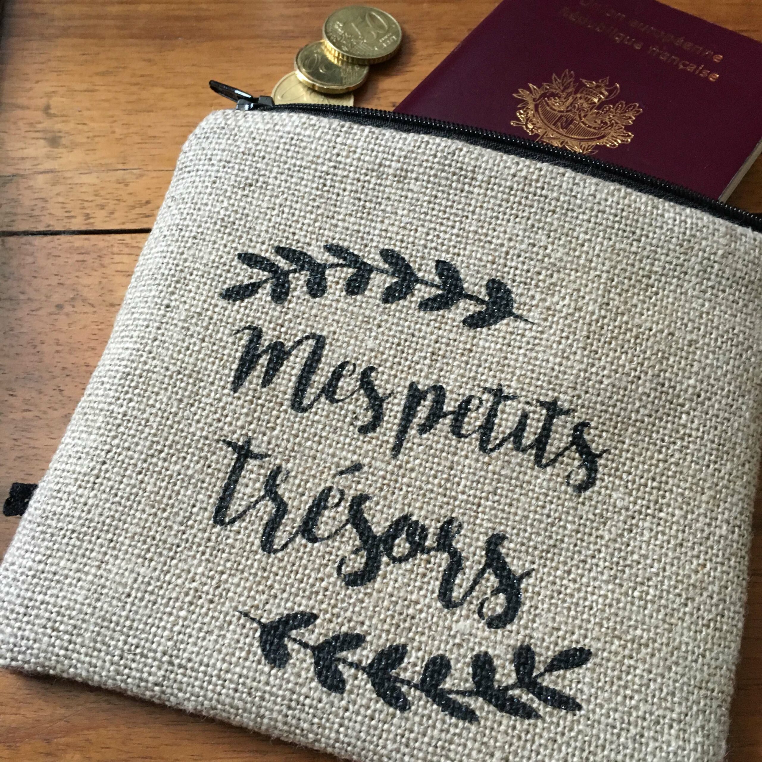Détails : Pochoir « Mes petits trésors » réalisé à la main au pochoir – Dentelle sur le côté gauche de la pochette.