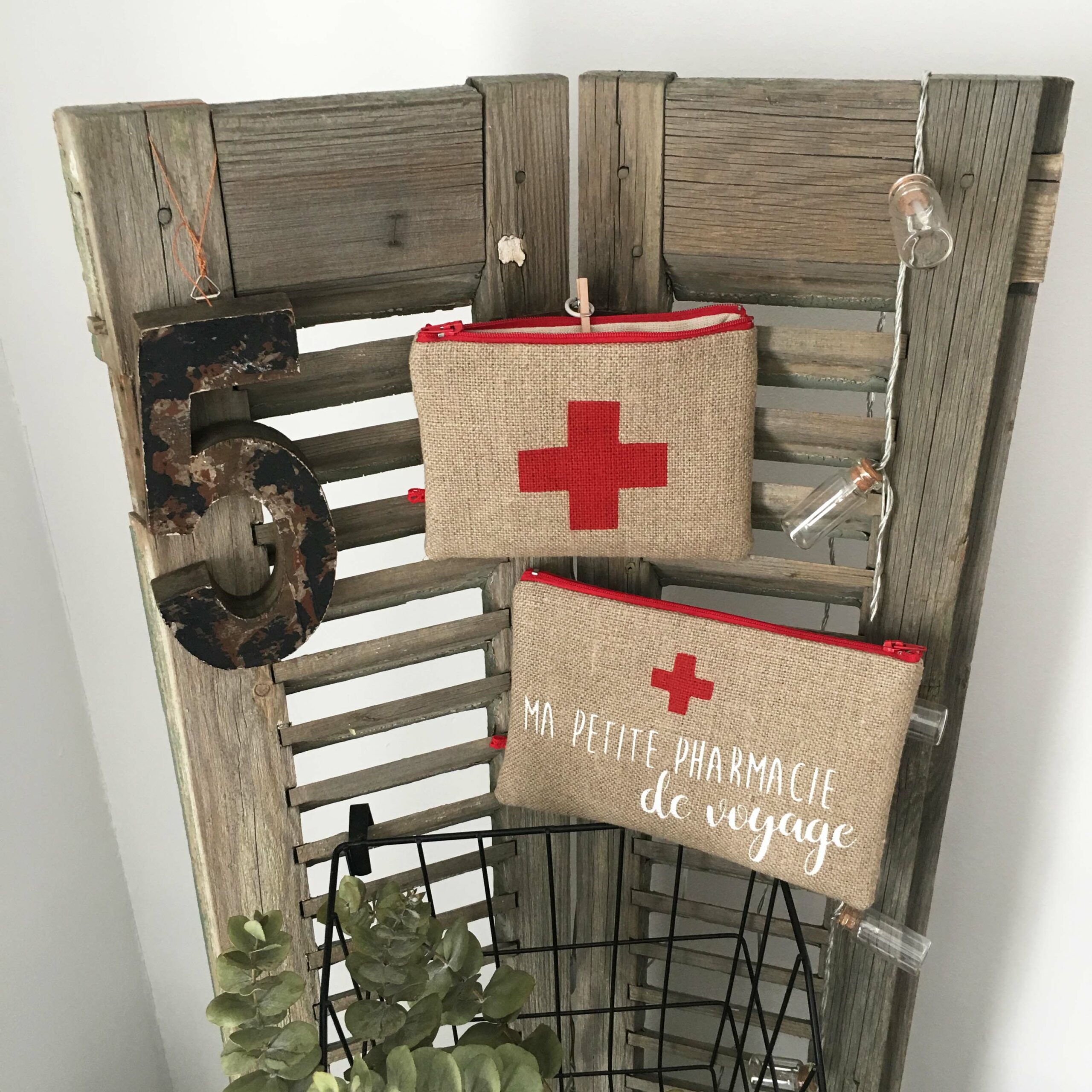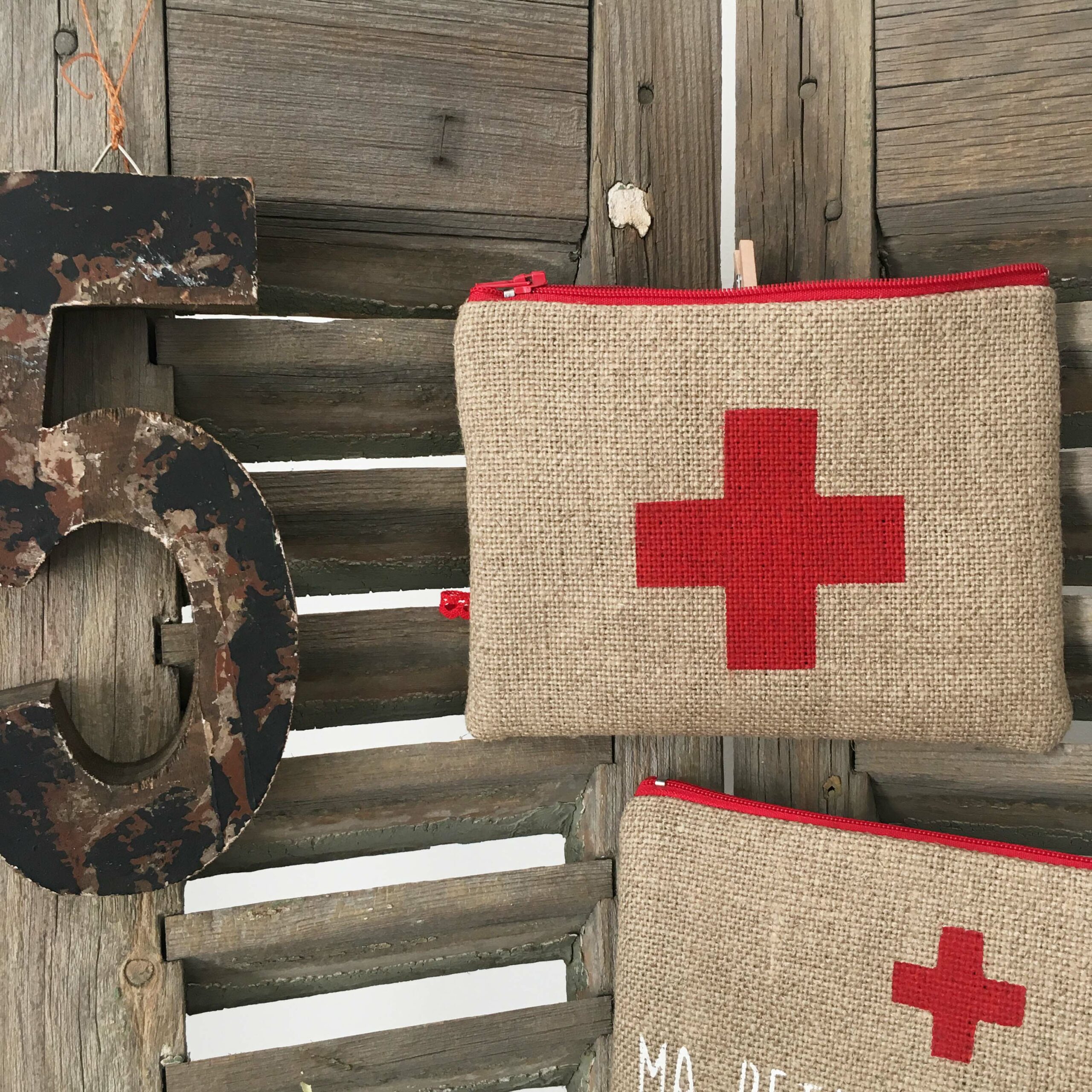 Détails : Pochoir croix rouge, « Ma petite pharmacie de voyage » réalisé en blanc et rouge à la main au pochoir – Dentelle sur le côté gauche de la pochette.