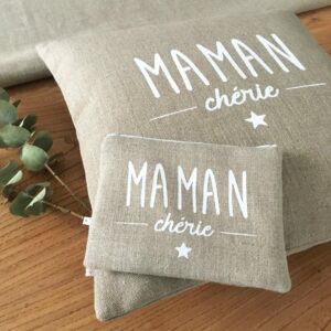 Collection Fête des Mères 2018  Coffret « Maman Chérie » Le contenu du coffret :  – Un coussin 100% lin entièrement réalisée à