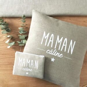 Collection Fête des Mères 2018  Coffret « Maman Câline » Le contenu du coffret :  – Un coussin 100% lin entièrement réalisée à
